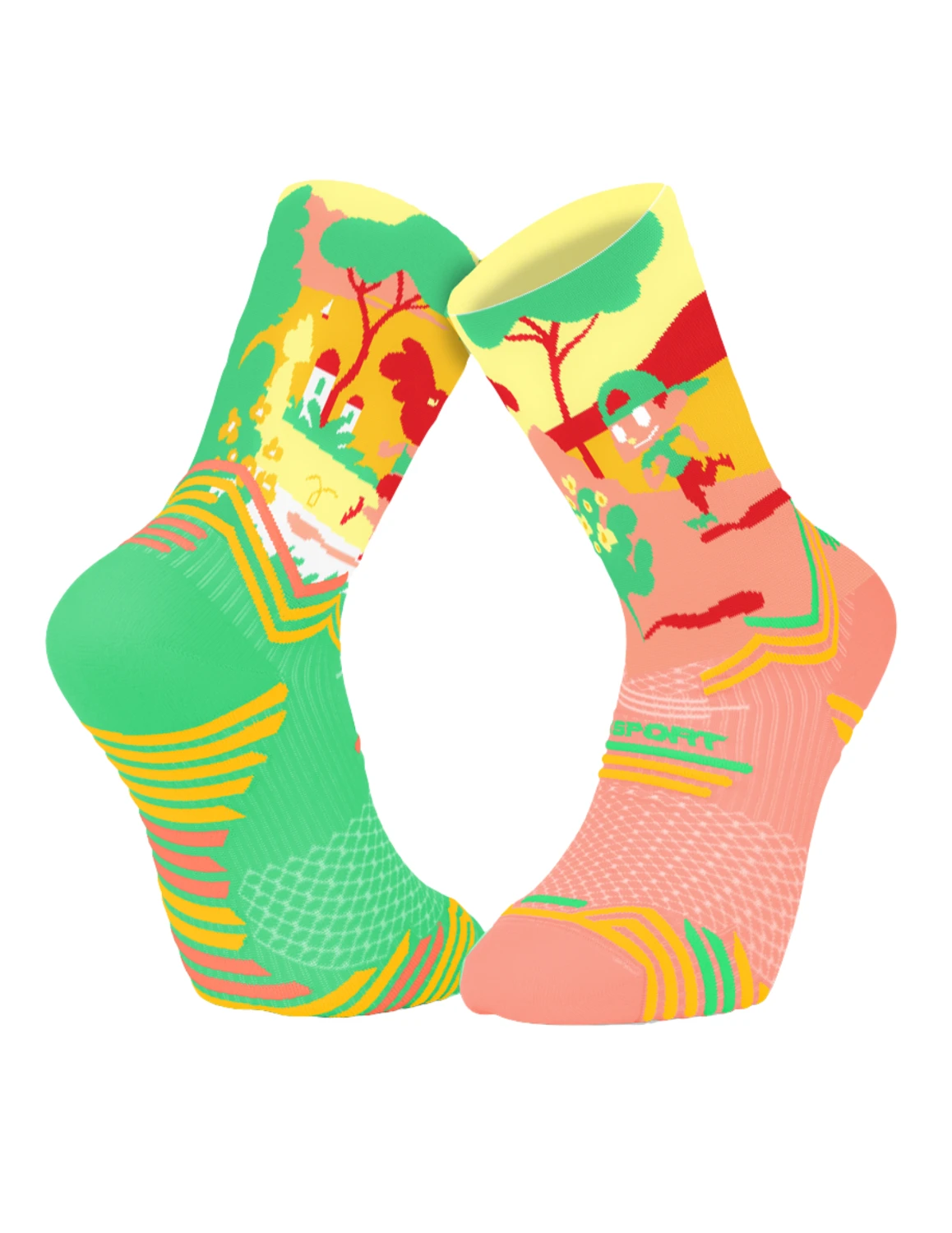 Fruit d’une collaboration entre BV Sport et Des Bosses et des Bulles (DBDB), ces chaussettes fabriquées en France allient ainsi tout le savoir-faire et la technicité de la marque stéphanoise, et l’univers fun et décalé de l’artiste Matthieu Forichon qui transpose comme personne la planète trail dans ses dessins.