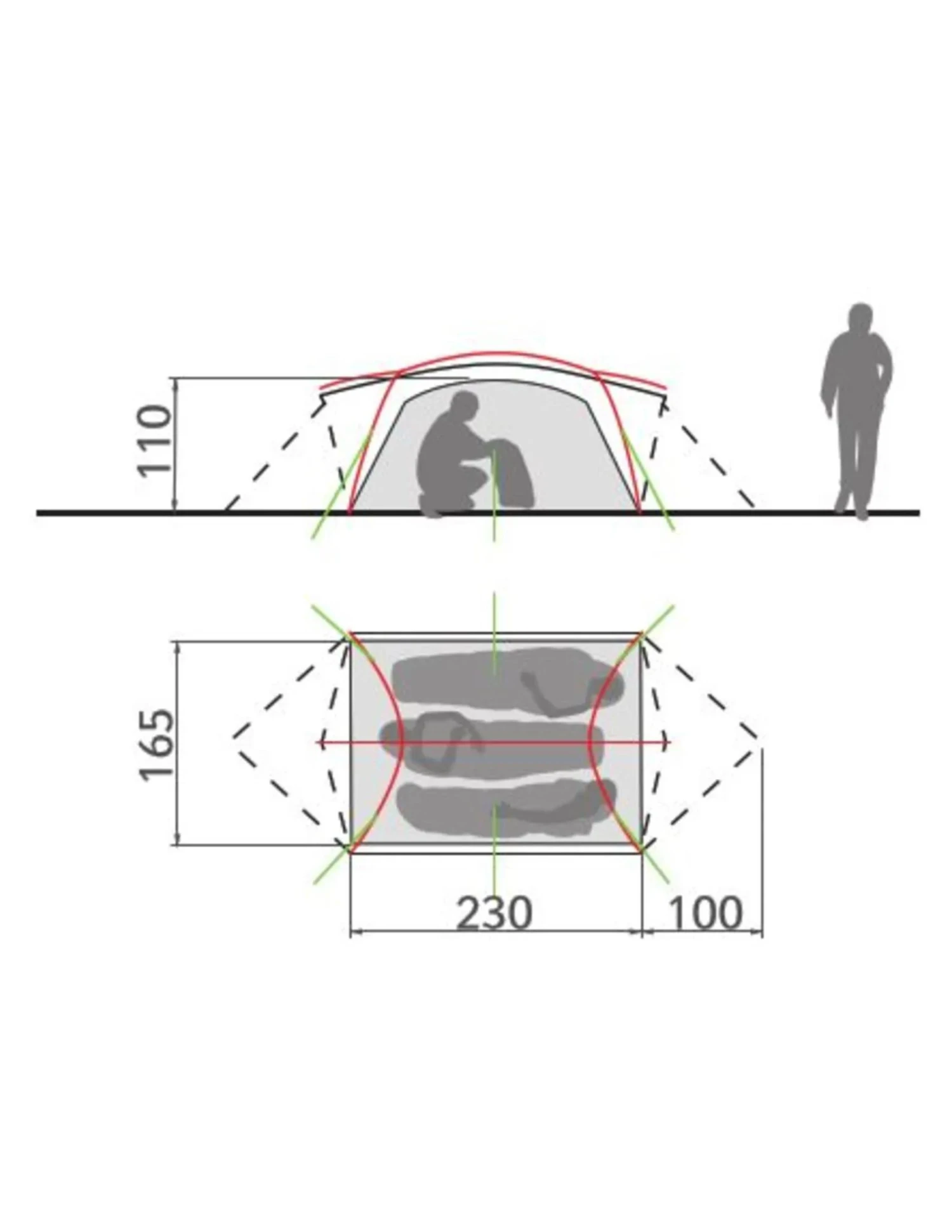 La construction à arceaux optimisée permet une tenue autoportante sans qu’on n’ait à tendre la tente et garantit un grand espace intérieur et une bonne hauteur. L’échange d’air est optimisé grâce aux bords légèrement relevés du double-toit et aux ouvertures de ventilation protégées de la pluie au niveau des entrées. La porte de tente intérieure avec empiècements d’aération en mesh anti-moustique procure également une bonne ventilation sur la durée.
